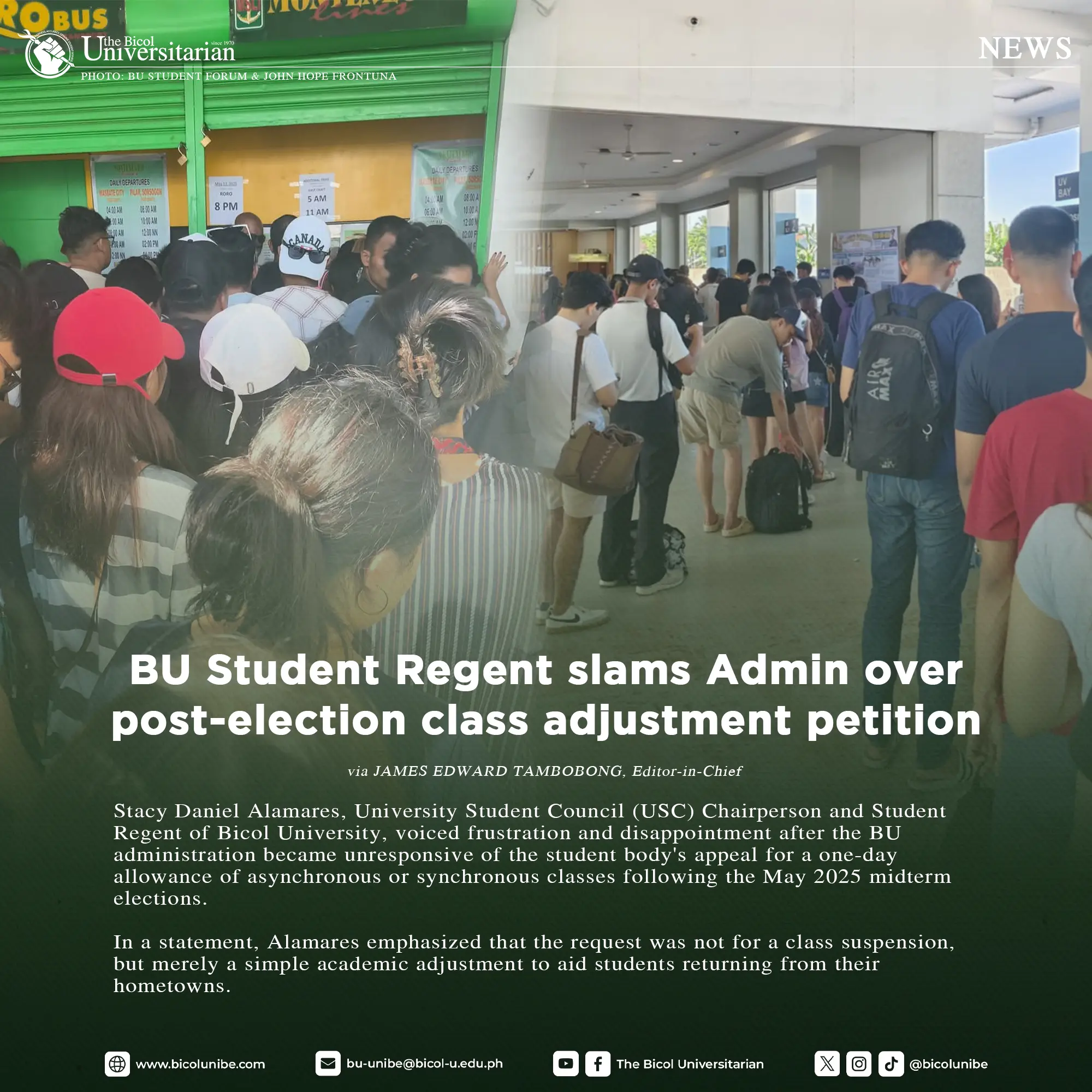 Stacy Daniel Alamares, University Student Council (USC) Chairperson and Student Regent of Bicol University, voiced frustration and disappointment after the BU administration became unresponsive of the student body's appeal for a one-day allowance of asynchronous or synchronous classes following the May 2025 midterm elections.